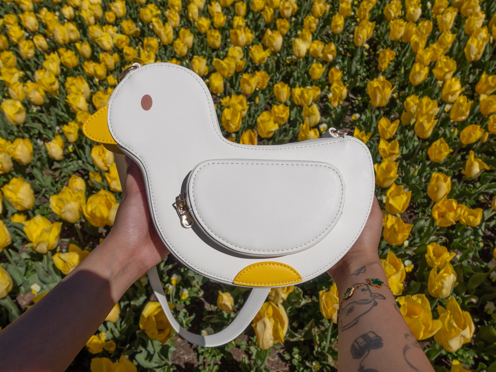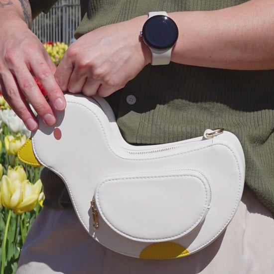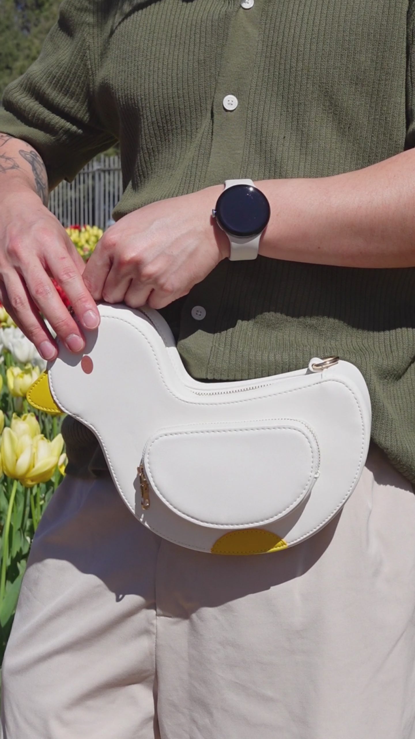 This silly goose bag has removable straps that allows you to wear the bag as either a shoulder bag or waist bag! Both bags include a small zip pocket and open pocket inside.